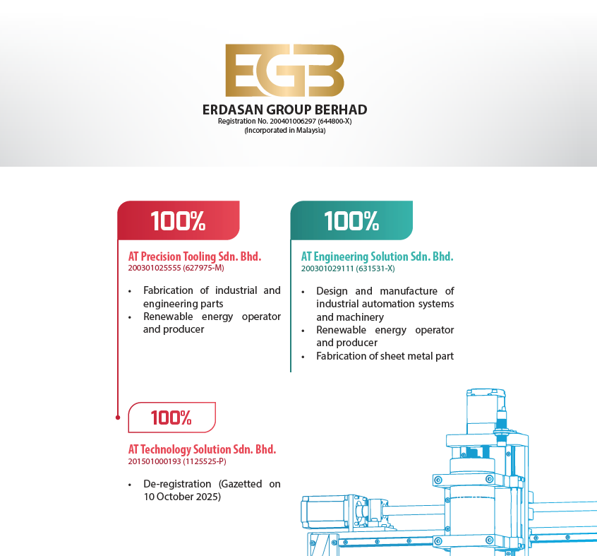 Erdasan Group Berhad (formerly known as AT Systematization Berhad) was incorporated in Malaysia on 8 March 2004 under Companies Act, 1965 as a public limited company under the name of AT Systematization Berhad. The Company was subsequently listed on the MESDAQ Market (now known as ACE Market) of Bursa Malaysia Securities Berhad on 23 February 2005. The Company changed its name to Erdasan Group Berhad in October 2024.